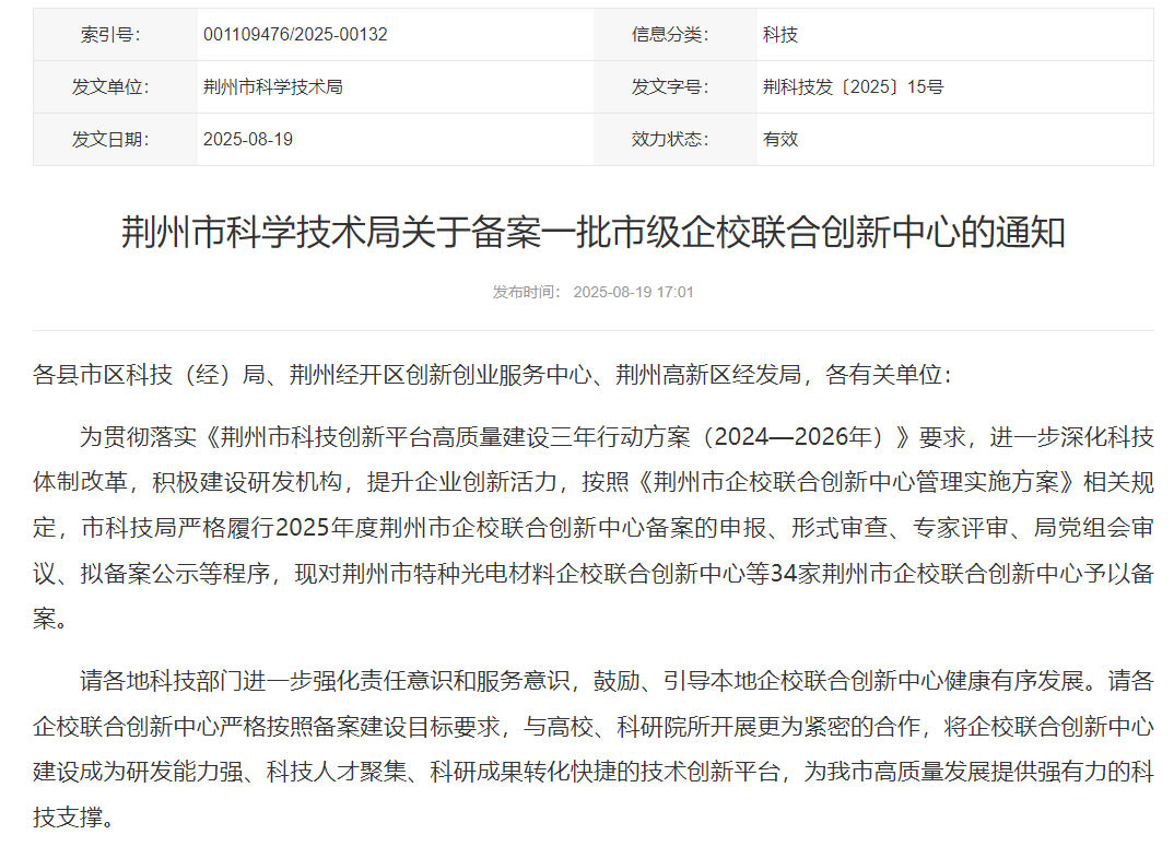 根据《荆州市科学技术局关于备案一批市级企校联合创新中心备案的通知》(荆科技发〔2025〕15号),学院与中节能(监利)太阳能科技有限公司联合申报的荆州市光伏新能源企校联合创新中心顺利通过备案。