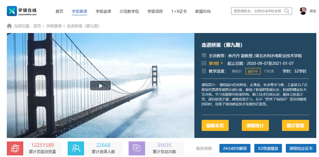《走进桥梁》在线开放课程利用北京学银在线教学平台对全网开放,自2015年建课自今,已运营至第九期,累计页面浏览量达12251588,选课人数高达22668人,课程用“互联网+”等现代信息技术手段,率先推进课程改革、教学方式与学习方式变革,极大地提高教学质量,在省内外具有良好的示范效应和影响力。此次又一重大国家级荣誉的认定,是我院近年来全面推进信息化课程与智慧化课堂的成果积累,将进一步推动学院在新时期高质量发展主题下三教改革的步伐。