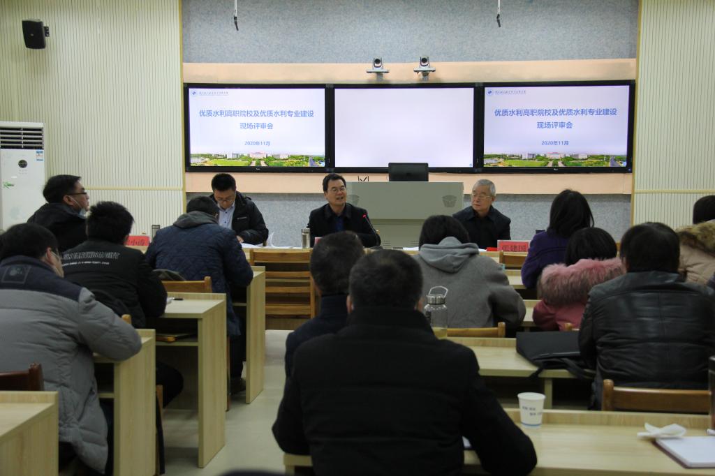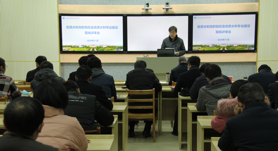 (教务处)11月26日,依据水利部安排,以杨凌职业技术学院水利工程分院院长郝红科教授为组长的专家组一行3人,到我院开展全国水利优质院校及优质水利专业评审与验收。学院领导班子成员、各系部负责人、教学主任、专业负责人、相关专业教师等参加现场评审会。学院党委委员、电子电力系主任丁官元主持会议。