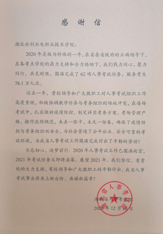 (庹琳)近日,学院收到来自湖北省人事考试院的感谢信,感谢学院领导和广大教职工对人事考试组织工作高度重视,扎实做好疫情防控,制定详实考务方案,确保了疫情防控和考务组织双安全,为社会营造了公平公正、安全可靠的考试环境,为全省人事考试工作圆满完成付出了辛勤劳动。