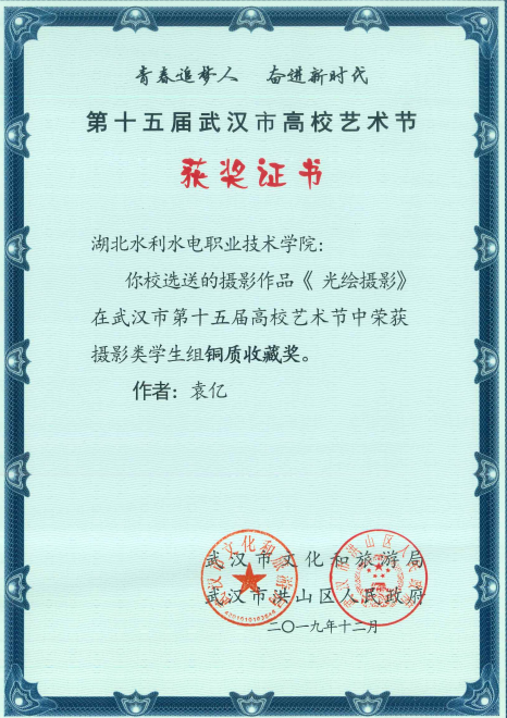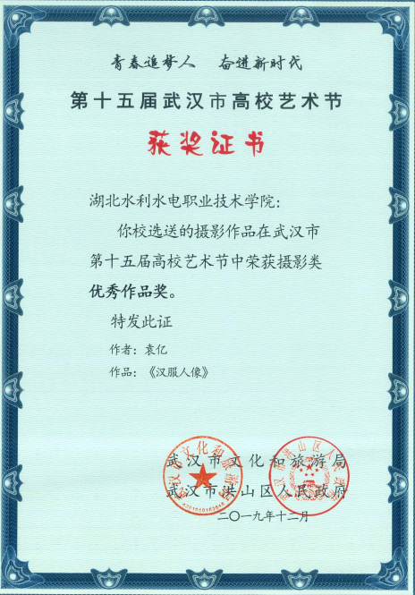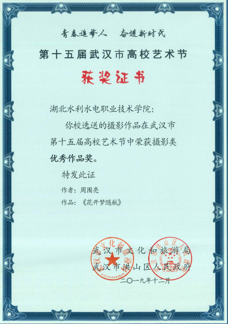 我院师生积极参与本次艺术节的摄影作品征集活动,水利工程系18级测量1班学生周围亮摄影作品《花开梦随航》荣获优秀作品奖,水利工程系18级水利8班学生袁亿两幅摄影作品《光绘摄影》、《汉服人像》分别荣获铜制收藏奖和优秀作品奖。此外,这两位学生以及我院建筑工程系邱兰老师的作品被第十五届武汉市高校艺术节摄影比赛优秀作品集收录出版。