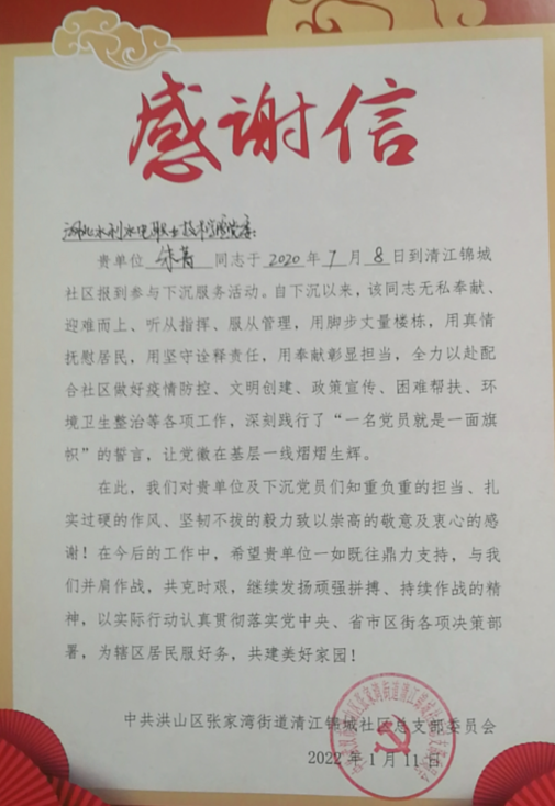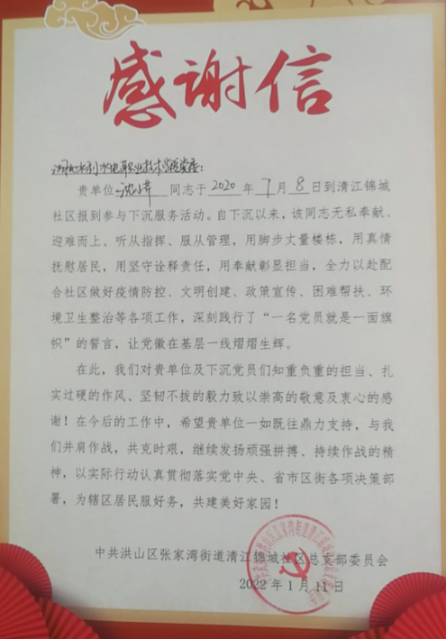 (邵元纯)1月12日,学院收到了两封来自洪山区张家湾街道清江锦城社区党总支的感谢信。信中表扬我院建筑工程系第二党支部下沉党员沈小芹和朱菁两位同志助力社区抗疫,为该社区疫情防控、文明创建、政策宣传、困难帮扶、环境卫生整治等各项工作做出了重要贡献,特此向我院表示衷心感谢,并向我院全体下沉党员知重负重的担当、扎实过硬的作风、坚韧不拔的毅力致以崇高的敬意及衷心的感谢!