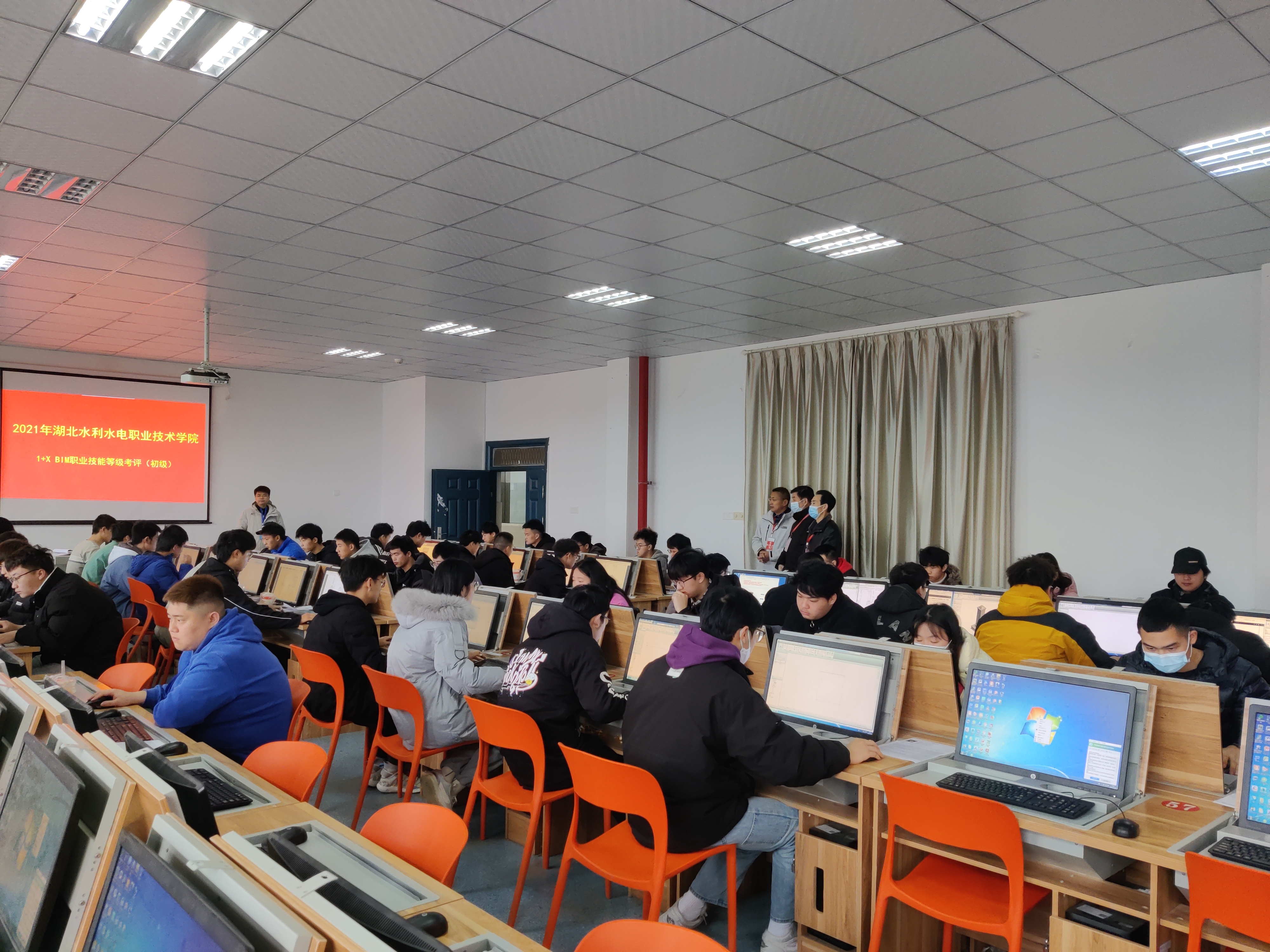 (朱菁 罗中)12月25日,2021年“1+X”BIM职业技能等级考试在我院考点开考。此次考试由学院负责组织和实施,省建协负责主考和技术支持,考试采用机考形式进行,历时三个小时,考场实行全程录像监控,考生全程人脸识别,考试结果由系统平台自动打分,公平公开公正。省建筑业协会领导专程来到我院考点现场进行考试巡视。