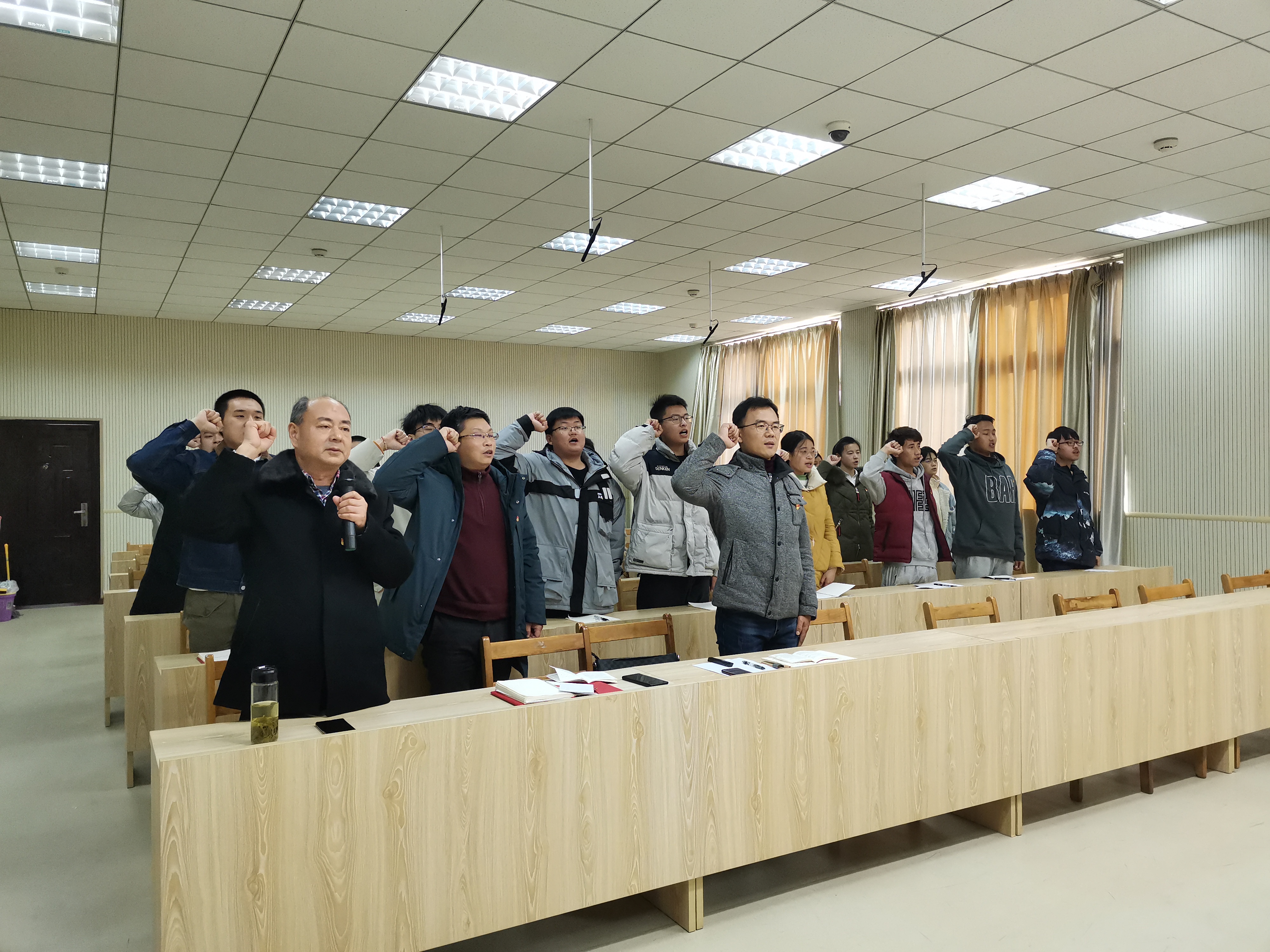 在清点人数、交纳党费、学习《中国共产党章程》第一章党员部分后,夏清炳带领2019级预备党员右手举拳,面向鲜红的党旗,以铿锵有力的声音、坚定的目光郑重宣誓加入中国共产党。铮铮誓言,表达了全体学生党员对党诚挚的感情和心声。