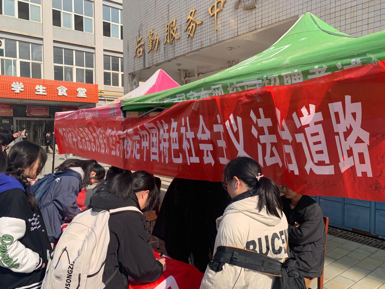 在宪法宣传周我院各系部组织学生在学院汤逊湖校区法治广场前开展“宪法宣传周”签名活动,并带领学生有序参观游览法治广场,在法治文化长廊,通过观看一幅幅法治典故,近距离领略法治文化,感受法治精神。