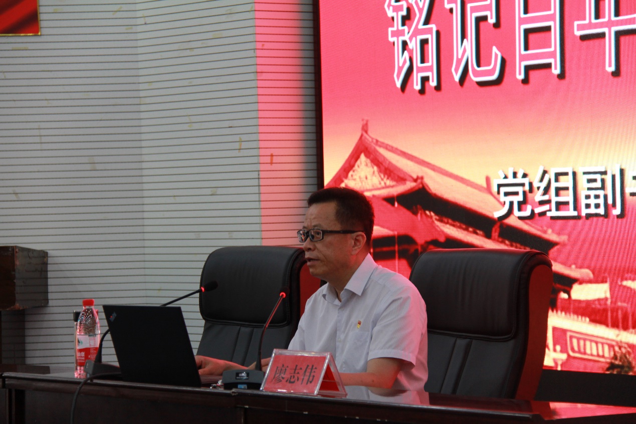 廖志伟以《铭记百年党史 践行初心使命》为题,通过列举大量具有鲜明特点的事实和案例,从党的不懈奋斗史、理论探索史、自身建设史、艰辛创业史四个维度,对党的光辉历史进行了系统阐释和深入解读。他指出,新时代党员干部要践初心担使命,必须要有时不我待、只争朝夕的精神,要有攻坚克难、敢于斗争的决心,要有干事创业、为民服务的本领,要有不兴伪事、求真务实的作风。