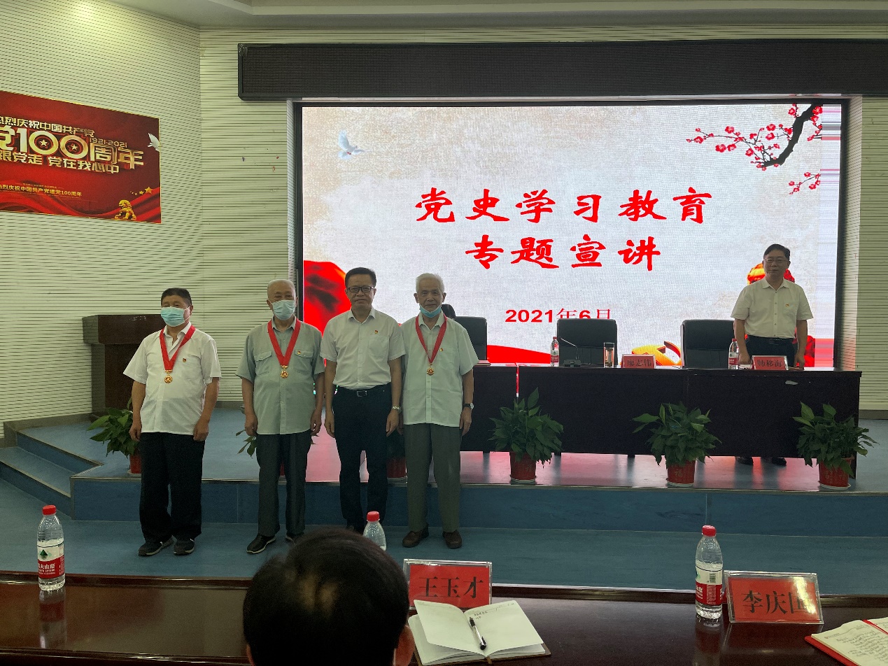 专题宣讲开始前,廖志伟代表厅党组慰问了省水职院老党员,并颁发了“光荣在党50年”纪念章。
