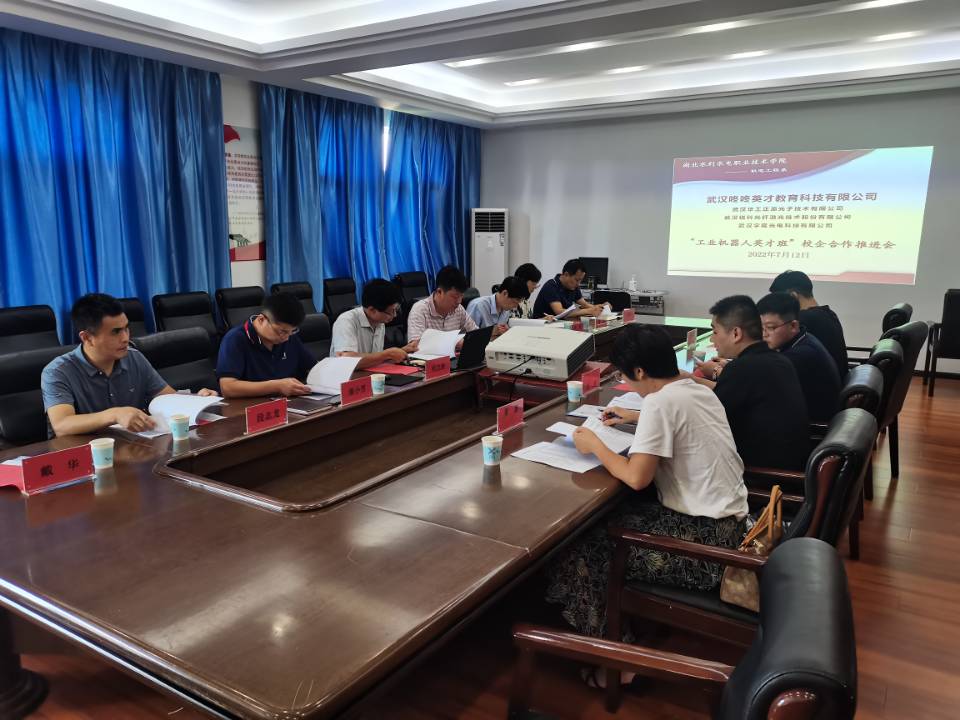 (戴华 邵军)7月12日,我院机电工程系在南湖校区机电楼会议室召开 “工业机器人英才班”校企合作推进会。学院党委委员、副院长黄泽钧,机电工程系负责人、工业机器人专业负责人和部分教师、武汉咚咚英才教育科技有限公司负责人参加了会议。